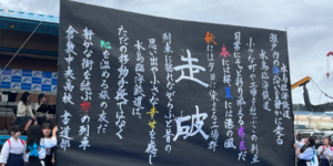 続く書道部は、吹奏楽部の生演奏に合わせて筆を走らせ、水島臨海鉄道をテーマにしたダイナミックな書を披露しました。大きな紙の中央に「走破」の文字を力強く書き、その周囲に水島臨海鉄道の沿線風景や地域とのつながりを表現する文を書き添えました。音楽と書の融合により、迫力と臨場感あふれるステージとなり、作品が掲げられると会場から大きな拍手と感嘆の声が広がりました。